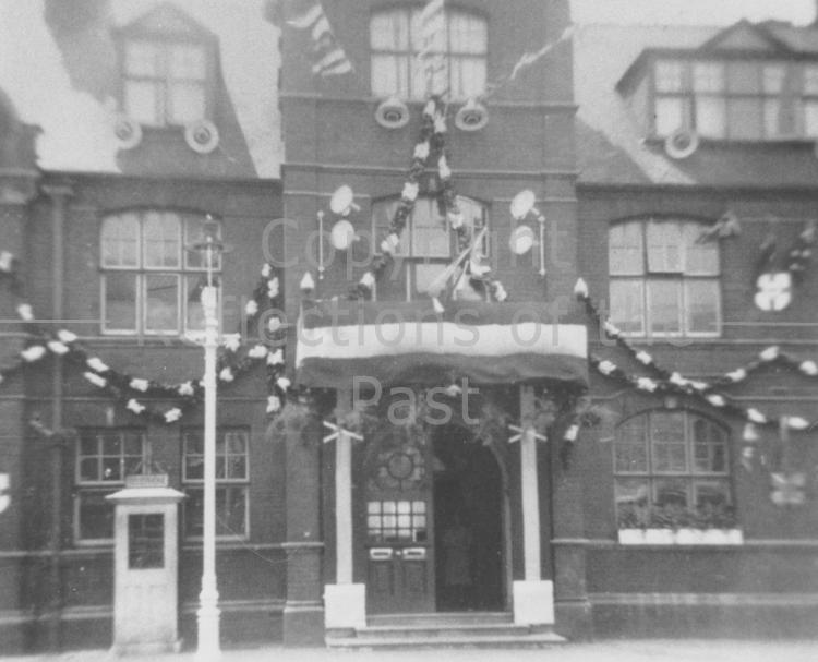 The front of the Town Hall decorated for the Coronation of Elizabeth 2nd in June 1953.