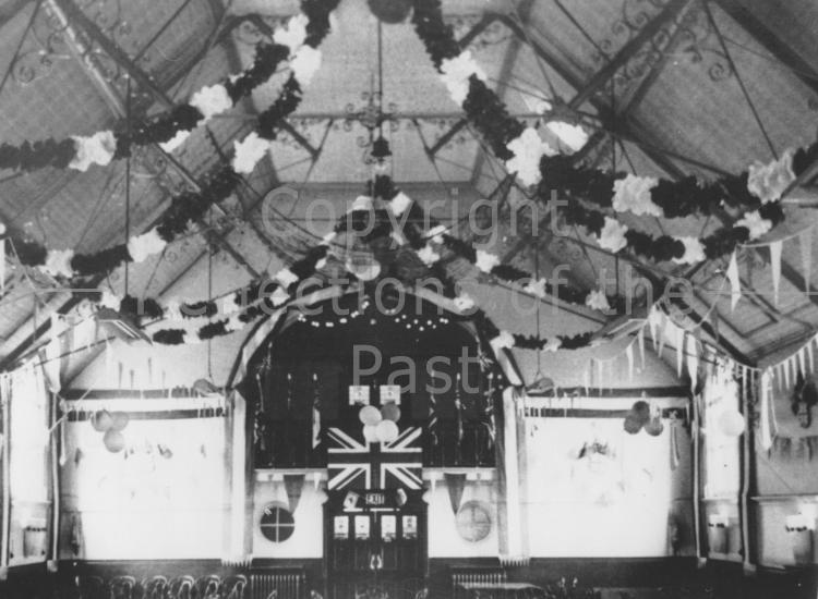Inside the Town Hall looking towards the entrance hall. Decorated for the Coronation of Elizabeth 2nd.