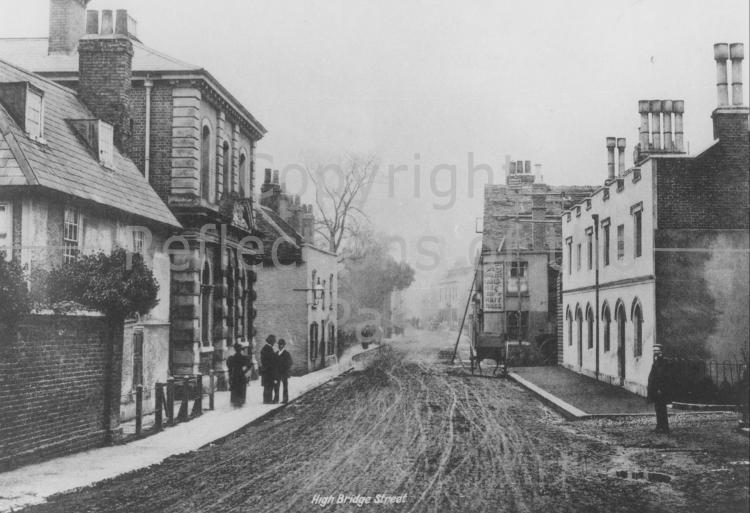 Highbridge Street viewed from the old Refinery Bridge, looking east. The tall building was the County Court. On the right are the Ordnance Arms Public House and the Alms Houses. All these buildings were destroyed by a V2 Rocket, in March 1945. This photograph c1895.