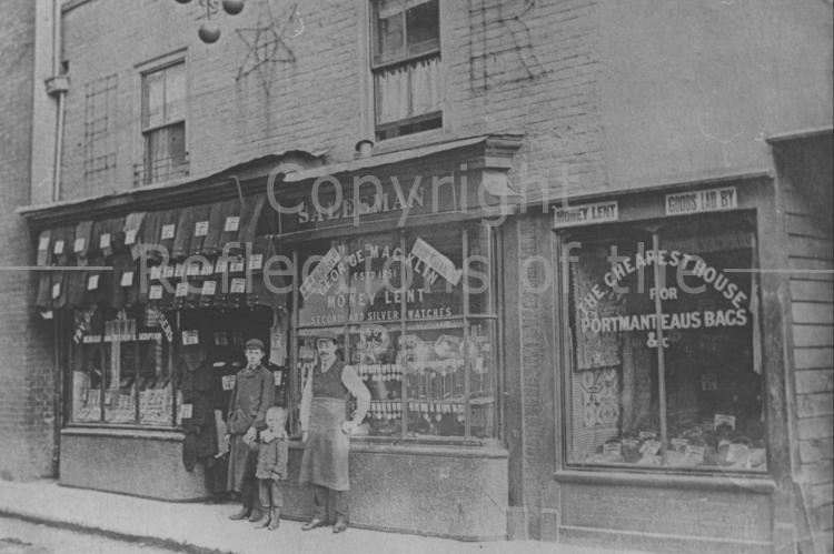 George Macklin's Pawnbrokers Shop, 19, Highbridge Street. The E*R on the wall above is for the Coronation of Edward 7th in 1902. Macklin sold a a variety of goods as well as the Pawnbrokers side. This picture 1902.