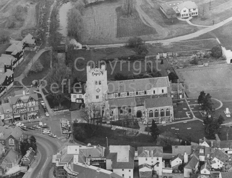 An aerial view of Waltham Abbey Church and precincts. Top right is the newly developed, Lea Valley Park Countryside Centre. In 2008 it became the new Parish Centre. Photograph c1988.