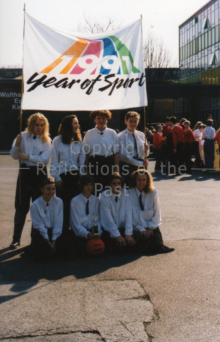 Girl's Football Team pose at the Press Launch for the 1991 Heritage Week Football Tournament. Photograph taken in the school car park. Names needed.