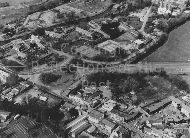 An aerial view of Highbridge Street and the Royal Gunpowder Mills site. The roundabout at Powdermill Lane can be seen on the left of the picture. This picture c1985.